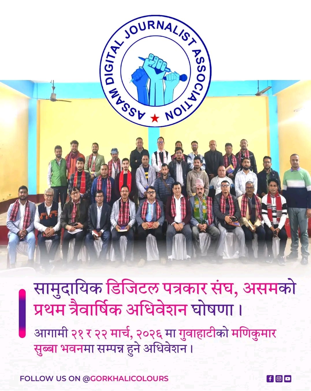 सामुदायिक डिजिटल पत्रकार संघ (CDJU) को अधिवेशन घोषणा यसै ऐतिहासिक अवसरमा ‘सामुदायिक डिजिटल पत्रकार संघ, असम’ को पहिलो त्रै-वार्षिक अधिवेशन आगामी २१ र २२ मार्च २०२६ मा गुवाहाटीको मणिकुमार सुब्बा भवनमा गर्ने औपचारिक घोषणा गरियो। संघका सल्लाहकारहरू नन्द किराती देवान, विकास छेत्री, शान्ता सिर्पाली र प्रकाश कोइरालाको उपस्थितिमा यो निर्णय लिइएको हो।